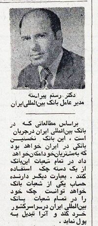 ۲۷ آبان ماه ۱۳۵۴ دکتر رستم پیراسته مدیر عامل بانک نوبنیاد بین المللی ایران در یک نشست با رسانهها به مناسبت گشایش مرکز بانک در تهران گفت: بر اساس بررسیهایی که در بانک بینالمللی ایران در جریان است، این بانک نخستین بانکی در ایران خواهد بود که به مشتریان خود امکان خواهد داد در همه شعبههای این بانک از یک دسته چک استفاده کنند. به عبارت دیگر دارنده حساب یکی از شعبات بانک خواهد توانست چک خود را در شعبههای دیگر بانک بینالمللی ایران در سراسر کشور خرد کند و آن را تبدیل به پول نماید. این بانک کوشش خواهد کرد علاوه بر خدمات معمولی بانکی، تسهیلات و خدمات ابتکاری جدیدی نیز در اختیارمشتریان خود بگذارد.