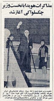 ۸ مهر ماه ۱۳۵۴ امیرعباس هویدا بامدادان با یک پرواز مستقیم هواپیمایی ملی ایران به پراگ پایتخت چکسلواکی پرواز کرد.[۷] دو ساعت پس از ورود به پراگ نویدا گفتگوهای رسمی هویدا با آقای لوبومیر استروگال نخست وزیر و دیگر پایوران چکسلواکی آغاز گردید. سفر رسمی دو روزه نخست وزیر به چکسلواکی بامداد روز سه شنبه پایان مییابد و هویدا از پراگ به سوی صوفیه پایتخت بلغارستان پرواز خواهد کرد و دو روز نیز گفتگوهایی با مقامات بلغارستان انجام خواهد داد.