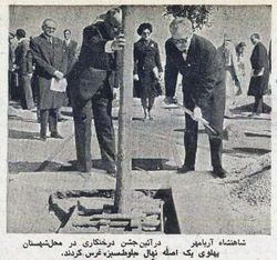 - ... توجه ویژه شاهنشاه آریامهر را میتوان از جملاتی که معظم له در سال ۱۳۳۶ بیان فرمودند دریافت: " آیین درختکاری از سنن مقدس نیاکان ما است. اگر این آیین درست اجرا شود در عمران و زیبایی و آب و هوای کشور تاثیر به سزایی دارد". برگزاری مراسم جشن درختکاری امسال در استان خوزستان یعنی سرزمینی که از مراکز بسیار قدیم تمدن کهن و درخشان ایران بوده است حائز اهمیت میباشد. این اقدام نمایشگر اهمیت بسیاری است که دولت برای این منطقه پر برکت و زرخیز کشور قائل است و با توجه به اینکه این سرزمین عملا دیباچه کتاب تاریخ پرافتخار و عظمت کشور ما به شمار میرود اهمیت انجام این مراسم در این نقطه روشن تر میشود. اگر ما میراث پر افتخار و کهنسال خود خود را در زیر تودههای عظیم خاک و شن که محصول سیلها و توفانها میباشد جستجو مینماییم علتش بهره برداری بی رویه ایست که نیاکان ما از منابع آب و خاک این منطقه به عمل آوردهاند. این رخدادهای بنیان کن و تکراری اگر باز به موقع پیشگیری نشود در زمان ما هم تجدید و تکرار خواهند شد. ...
