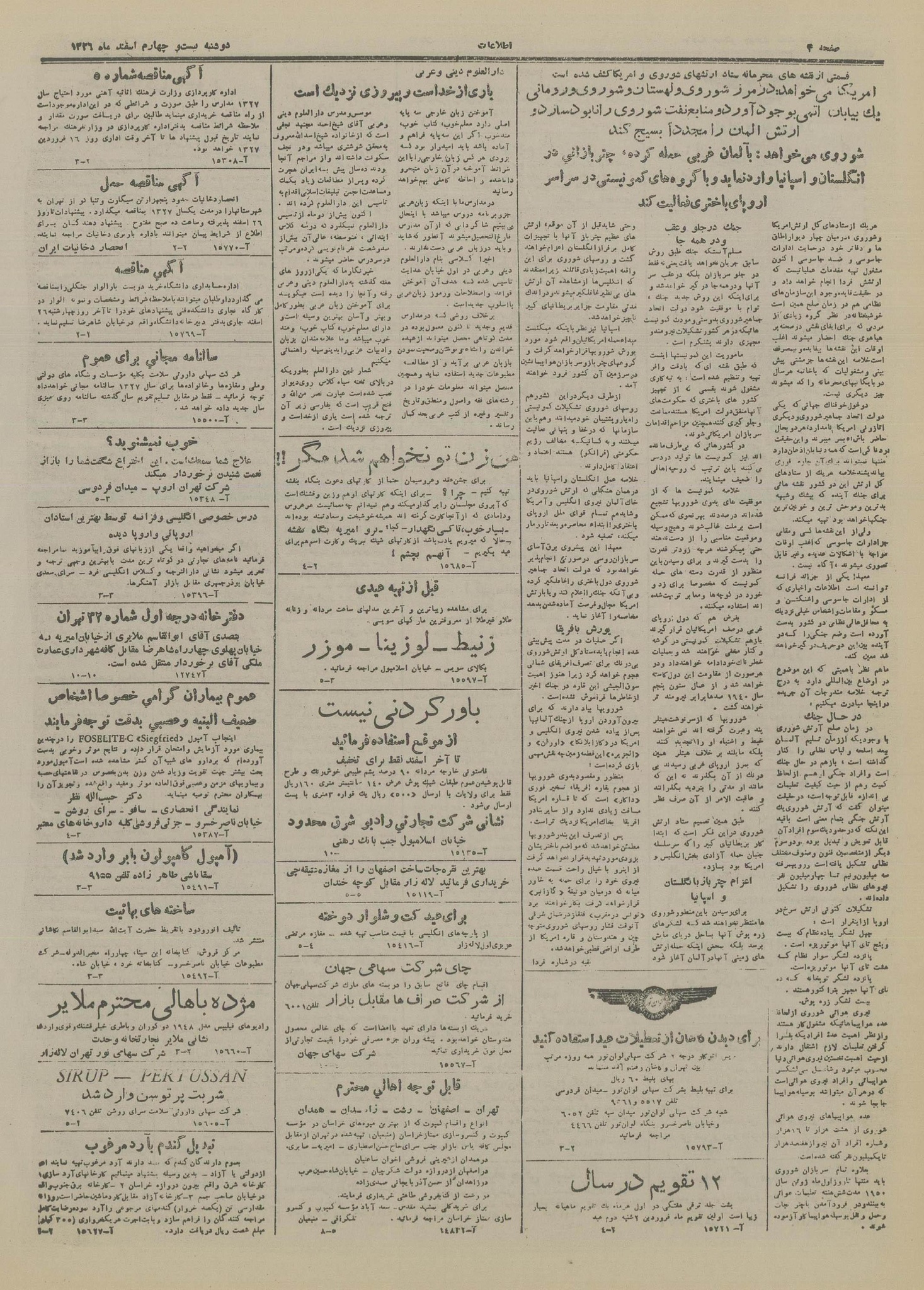 | کنونی | ۲۳ سپتامبر ۲۰۲۵، ساعت ۰۳:۴۱ | ۴٬۵۳۷×۶٬۲۶۲، ۸ صفحه (۶٫۹۱ مگابایت) | Bijan (گفتگو | مشارکتها) | == خلاصه == {{PD-Iran}} رده:روزنامه اطلاعات سال ۱۳۲۶ |