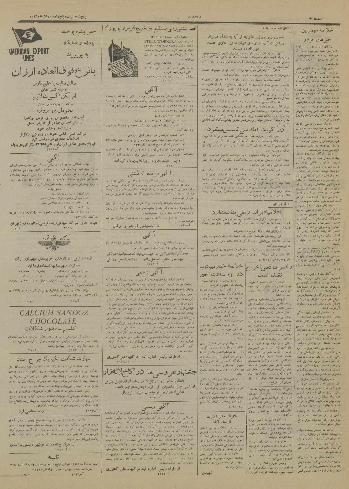 | کنونی | ۲۵ سپتامبر ۲۰۲۲، ساعت ۰۵:۴۳ | ۴٬۵۶۸×۶٬۲۸۵، ۸ صفحه (۷٫۵۲ مگابایت) | Bijan (گفتگو | مشارکتها) | == خلاصه == {{PD-Iran}} رده:روزنامه اطلاعات سال ۱۳۳۱ |