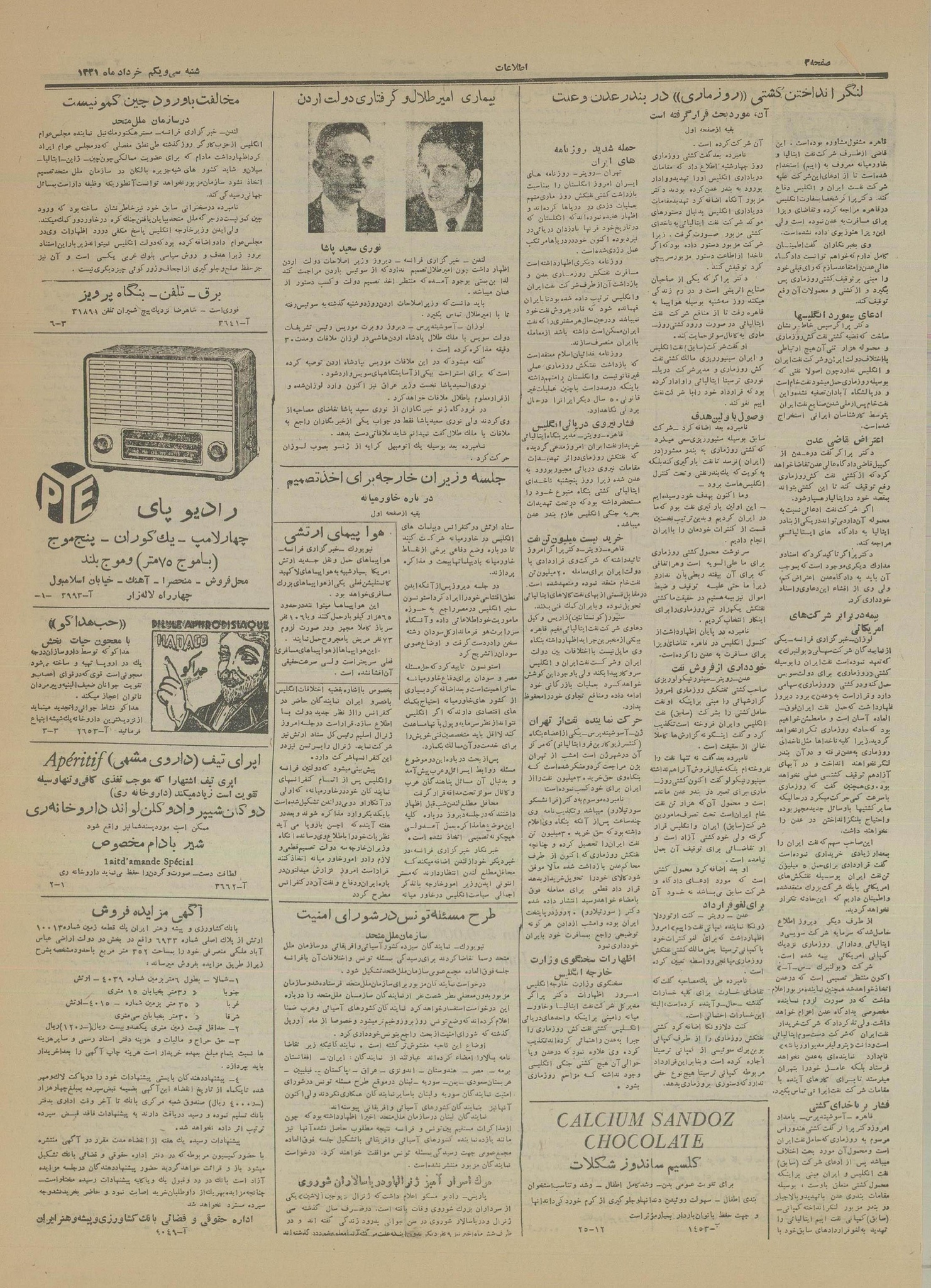 | کنونی | ۲۵ سپتامبر ۲۰۲۲، ساعت ۱۰:۵۷ | ۴٬۴۹۷×۶٬۳۱۰، ۱۰ صفحه (۹٫۳۹ مگابایت) | Bijan (گفتگو | مشارکتها) | == خلاصه == {{PD-Iran}} رده:روزنامه اطلاعات سال ۱۳۳۱ |