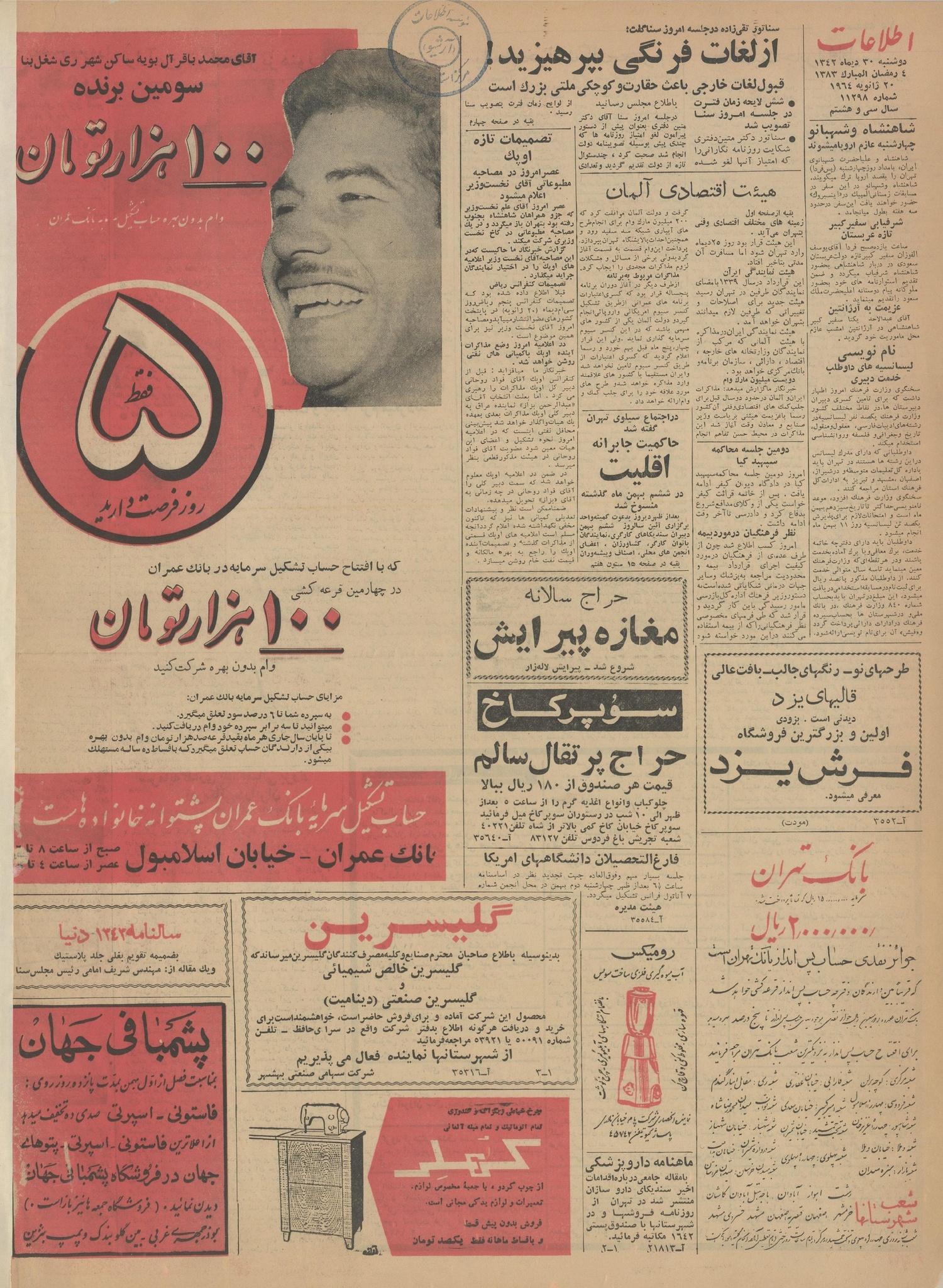 | کنونی | ۲۴ ژانویهٔ ۲۰۱۵، ساعت ۱۸:۳۳ | ۵٬۹۸۱×۷٬۹۶۶، ۱۶ صفحه (۳۵٫۳۴ مگابایت) | Bijan (گفتگو | مشارکتها) | {{PD-Iran}} رده:روزنامه اطلاعات سال ۱۳۴۲ |