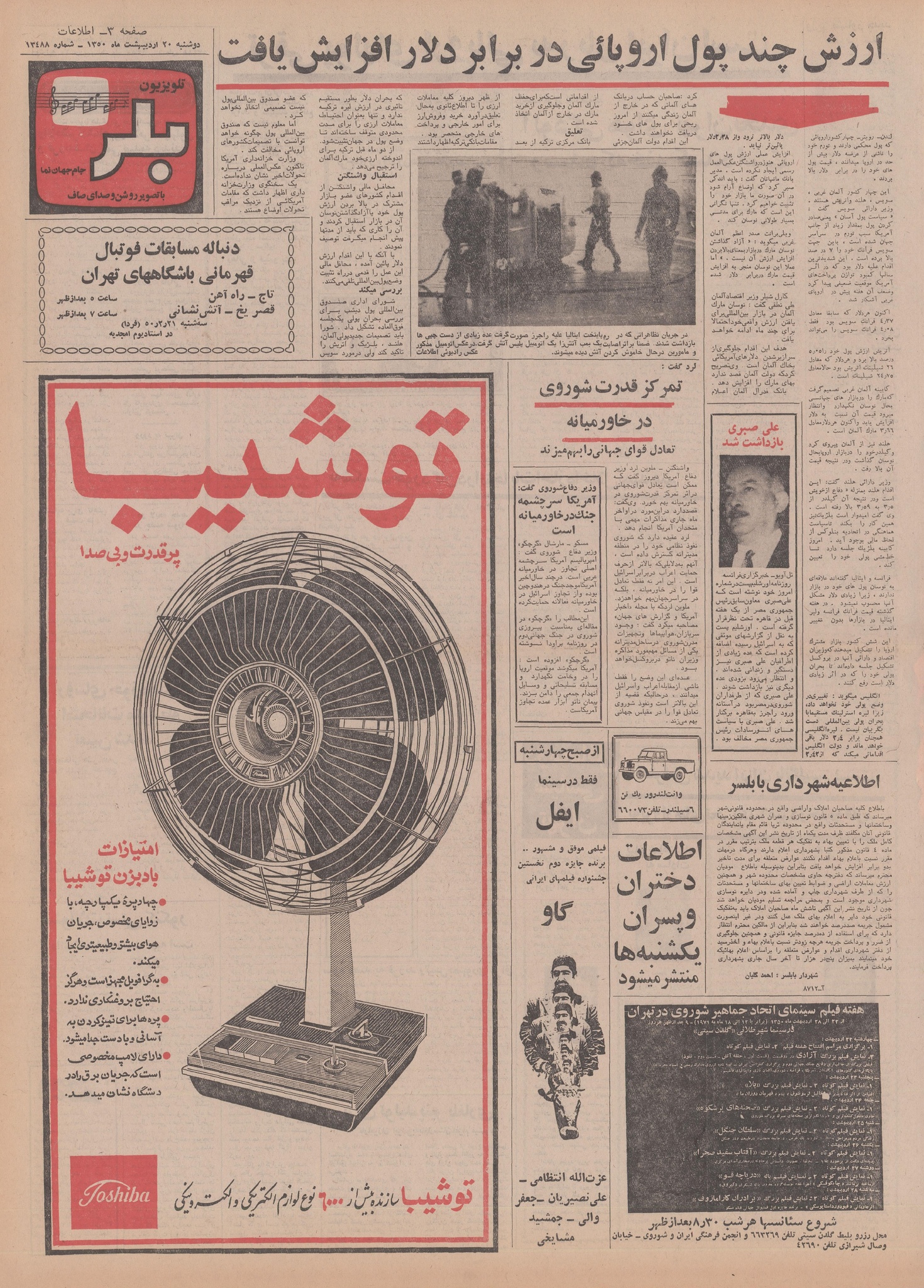 | کنونی | ۴ سپتامبر ۲۰۱۵، ساعت ۱۸:۰۶ | ۶٬۸۴۵×۹٬۴۳۹، ۲۰ صفحه (۵۹٫۴۳ مگابایت) | Bijan (گفتگو | مشارکتها) | {{PD-Iran}} رده:روزنامه اطلاعات سال ۱۳۵۰ |