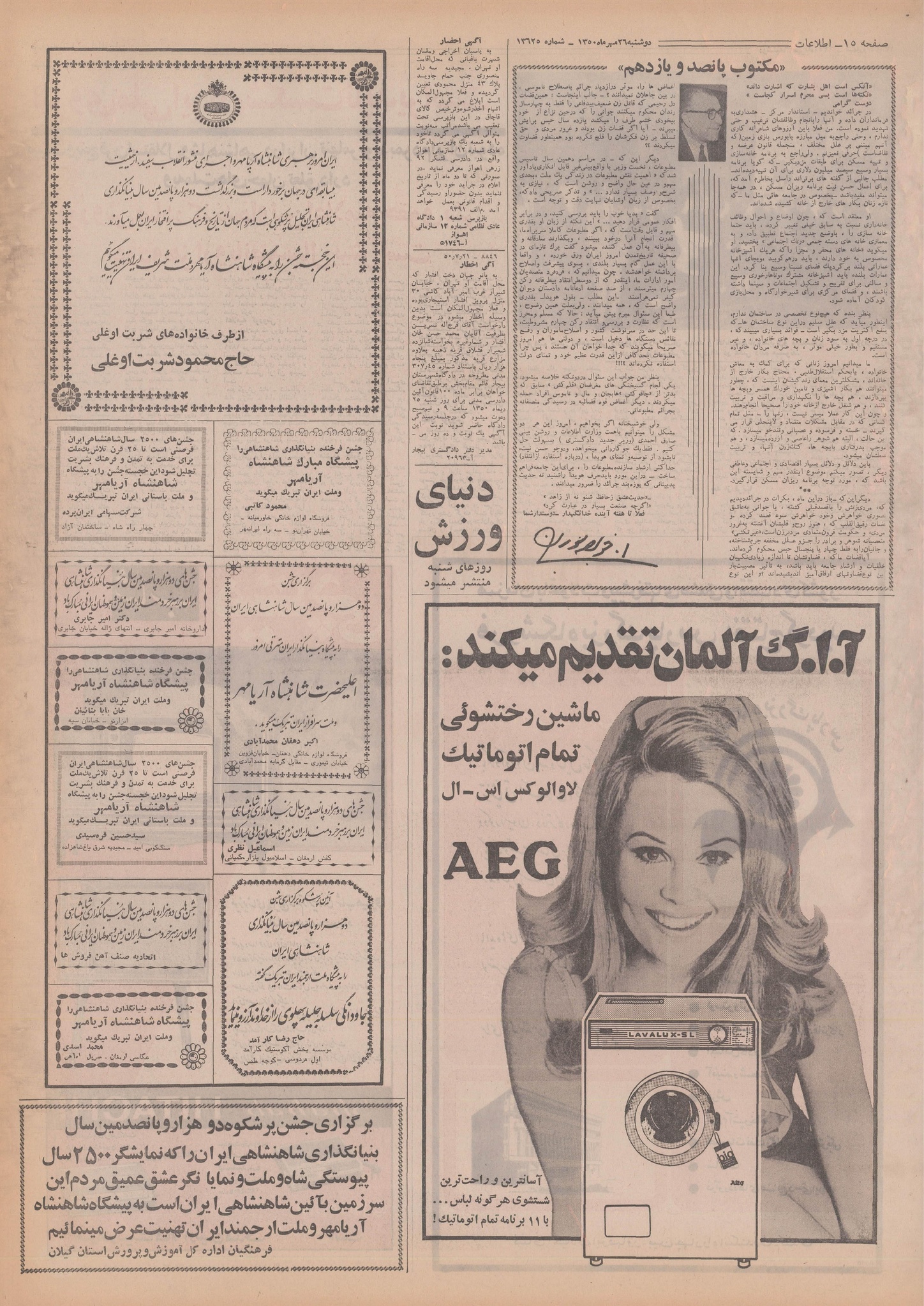 | ۲۰ اکتبر ۲۰۱۴، ساعت ۲۰:۴۴ | ۲٬۴۵۰×۳٬۵۲۷، ۲۱ صفحه (۵۴٫۲۸ مگابایت) | Bijan (گفتگو | مشارکتها) | {{PD-Iran}} رده:روزنامه اطلاعات سال ۱۳۵۰ |