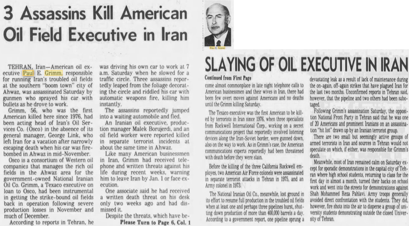 - ترور پل گریم و مالک بروجردی مدیران و کارشناسان بلندپایه نفت با رگبار گلولههای تروریستهای مجاهد و چریک اهواز ۲ دی ماه ۲۵۳۷ شاهنشاهی