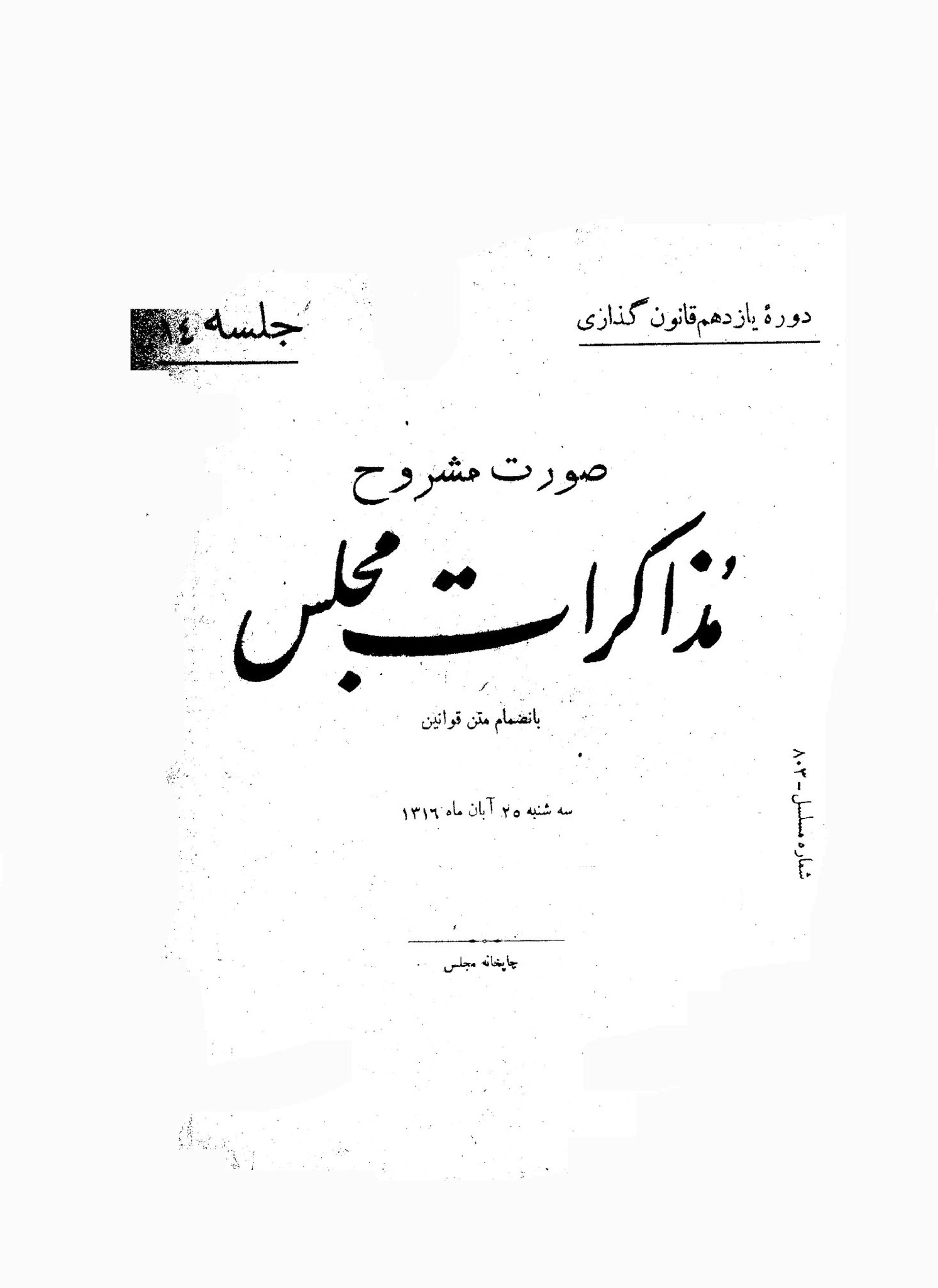 | کنونی | ۴ اکتبر ۲۰۱۳، ساعت ۰۶:۵۶ | ۳٬۰۵۴×۴٬۱۹۳، ۱۹ صفحه (۱۴٫۸۱ مگابایت) | Bijan (گفتگو | مشارکتها) | {{PD-Iran}} رده:مجلس شورای ملی قوانین دوره قانونگذاری یازدهم - ۲۰ شهریور ۱۳۱۶ تا ۲۷ شهریور ۱۳۱۸ |