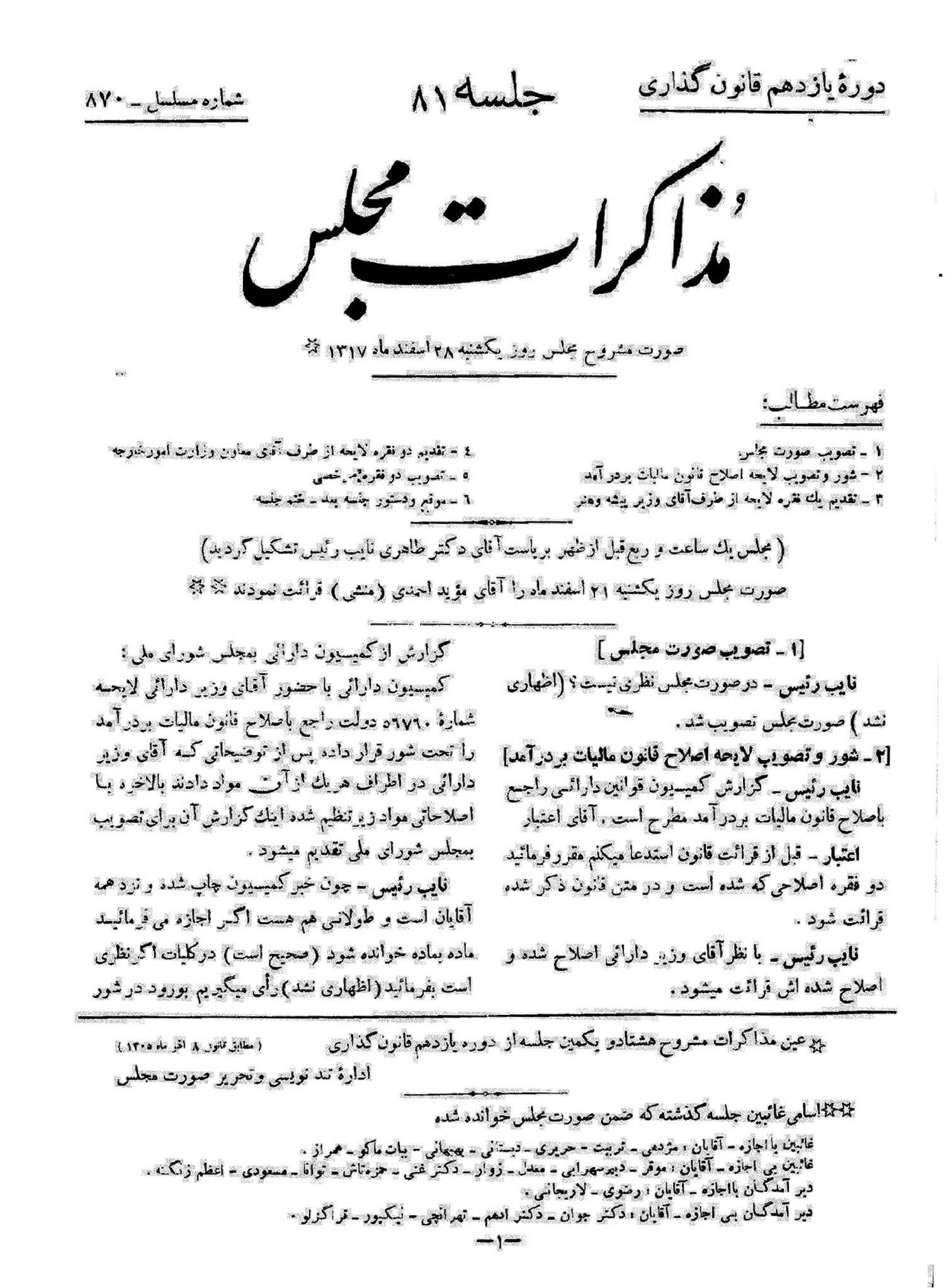 | کنونی | ۴ اکتبر ۲۰۱۳، ساعت ۱۲:۵۶ | ۲٬۶۴۵×۳٬۵۱۸، ۸ صفحه (۴٫۴۸ مگابایت) | Bijan (گفتگو | مشارکتها) | {{PD-Iran}} رده:مجلس شورای ملی مذاکرات دوره قانونگذاری یازدهم - ۲۰ شهریور ۱۳۱۶ تا ۲۷ شهریور ۱۳۱۸ |