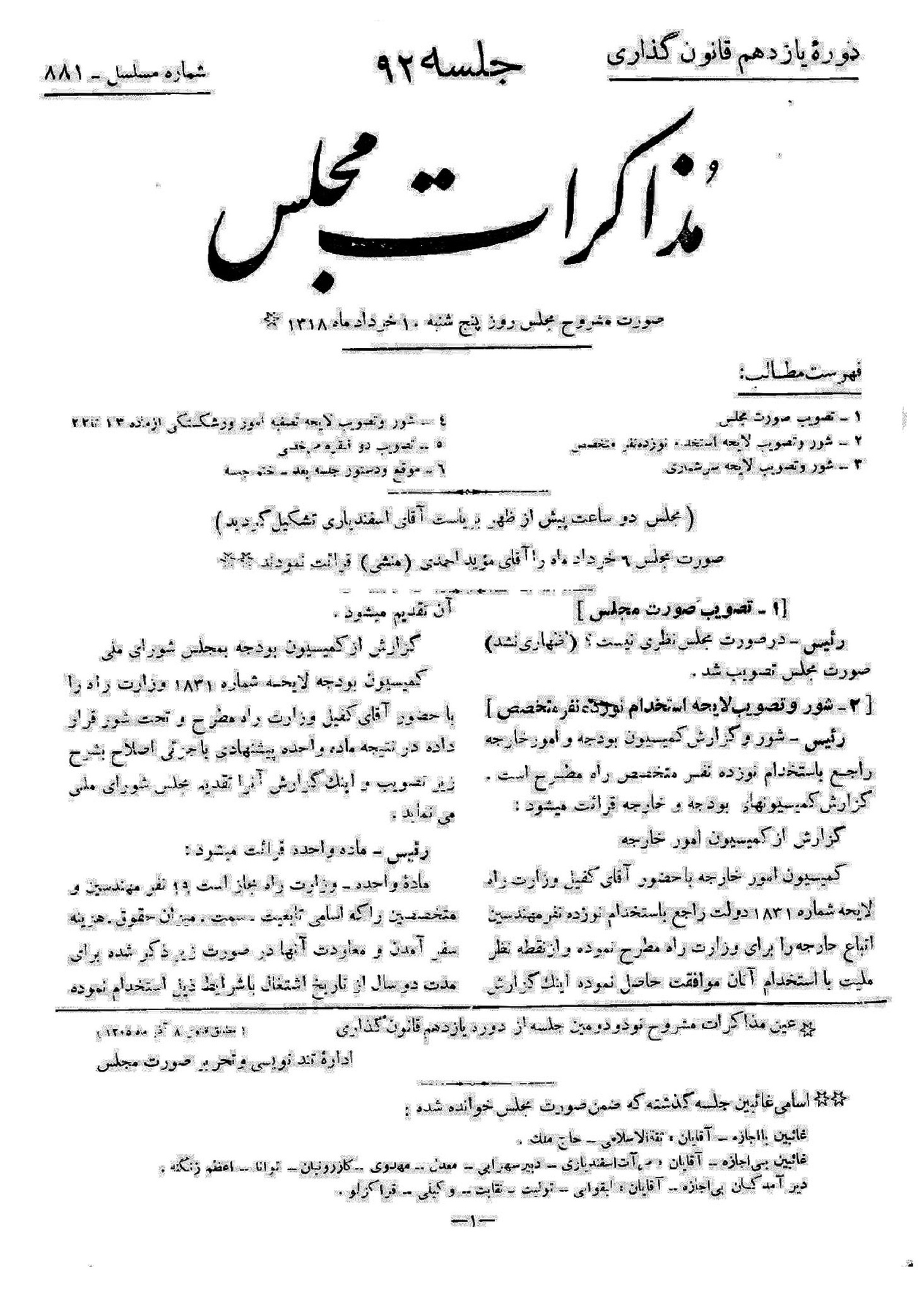 | کنونی | ۴ اکتبر ۲۰۱۳، ساعت ۱۳:۳۰ | ۲٬۵۵۰×۳٬۵۶۰، ۹ صفحه (۵٫۸۹ مگابایت) | Bijan (گفتگو | مشارکتها) | {{PD-Iran}} رده:مجلس شورای ملی مذاکرات دوره قانونگذاری یازدهم - ۲۰ شهریور ۱۳۱۶ تا ۲۷ شهریور ۱۳۱۸ |