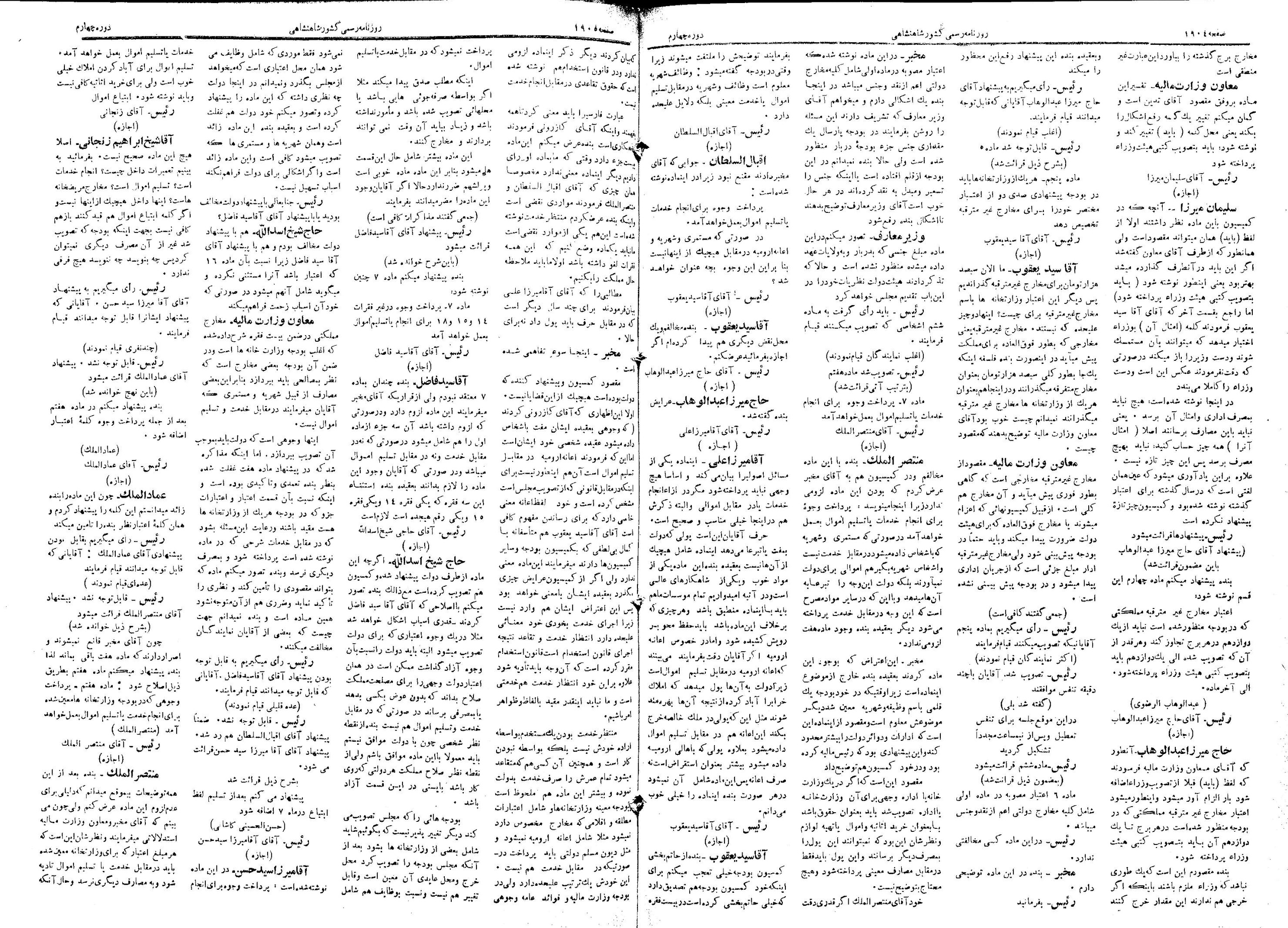 | کنونی | ۲۸ مهٔ ۲۰۱۳، ساعت ۰۹:۵۷ | ۱٬۴۸۱×۲٬۱۰۶، ۴ صفحه (۱۱٫۹۵ مگابایت) | Bijan (گفتگو | مشارکتها) | {{PD-Iran}} رده:مجلس شورای ملی مذاکرات دوره قانونگذاری چهارم - ۱ تیر ۱۳۰۰ تا ۳۰ خرداد ۱۳۰۲ |