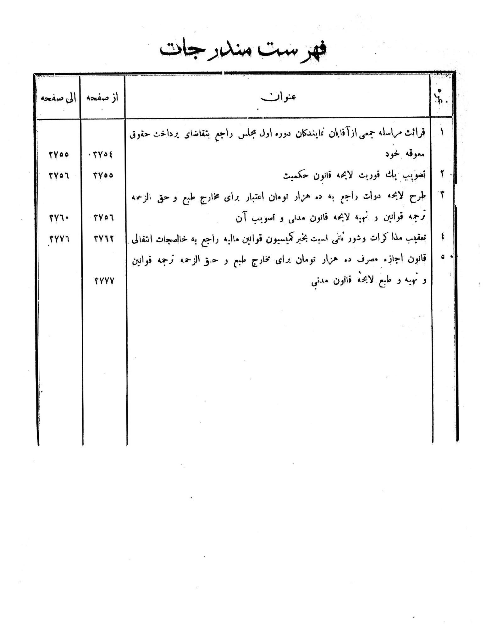| کنونی | ۱۳ ژوئیهٔ ۲۰۱۳، ساعت ۱۹:۴۳ | ۳٬۷۷۵×۵٬۳۶۶، ۱۵ صفحه (۱۴٫۵۸ مگابایت) | Bijan (گفتگو | مشارکتها) | {{PD-Iran}} رده:مجلس شورای ملی مذاکرات دوره قانونگذاری ششم - ۱۹ تیر ۱۳۰۵ تا ۲۲ امرداد ۱۳۰۷ |