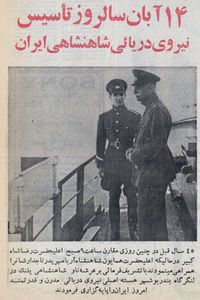 [[پرونده:RezaShahCrownPrince14Aban1311NavyDay.jpg|thumb|left| | [[پرونده:RezaShahCrownPrince14Aban1311NavyDay.jpg|thumb|left|200px|رضا شاه بزرگ به همراه ولیعهد محمدرضا پهلوی روز نیروی دریایی را بنیاد مینهند]] | ||