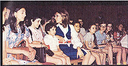 [[پرونده: FarahKanun.jpg|thumb|left|250px|شهبانو فرح همراه با شاهزاده فرحناز و لیلا پهلوی در مسابقه تاتر کتابخانه نیاوران]] | |||