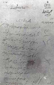 آیت‌الله کاشانی رییس مجلس شورای ملی نامه‌ای به تاریخ ۹ اسفند ماه ۱۳۳۱ به شماره ۱۳۷۸۵ به پیشگاه شاهنشاه نوشت: