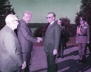شاهنشاه آریامهر پس از دیدار با پرزیدنت یابلونسکی در کاخ شورای وزیران لهستان با ادوارد گیرک [۲] دبیر اول حزب کارگر متحد لهستان دیدار و گفتگو کردند.