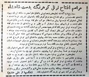 امروز در پیشگاه اعلیحضرت همایونی و علیاحضرت ملکه ثریا پهلوی یکی از آرزوهای دیرینه مردم اصفهان که سالیان دراز آن را در خاطره می‌گذرانده و توفیق آن حاصل نمی‌شده است انجام می‌گیرد، بر عموم اهالی اصفهان پوشیده نیست که توجه‌های ویژه شاهانه و دستورات موکد و بلیغی که در هر مورد برای شروع و اتمام کار کوهرنگ صادر فرموده‌اند عامل موثر و عمده در پیشرفت کار بوده است و بحمدالله امروز این آرزوهای اهالی اصفهان جامه عمل می‌پوشد و به دستور شاهنشاه معظم مراسم افتتاح کوهرنگ انجام می‌شود.