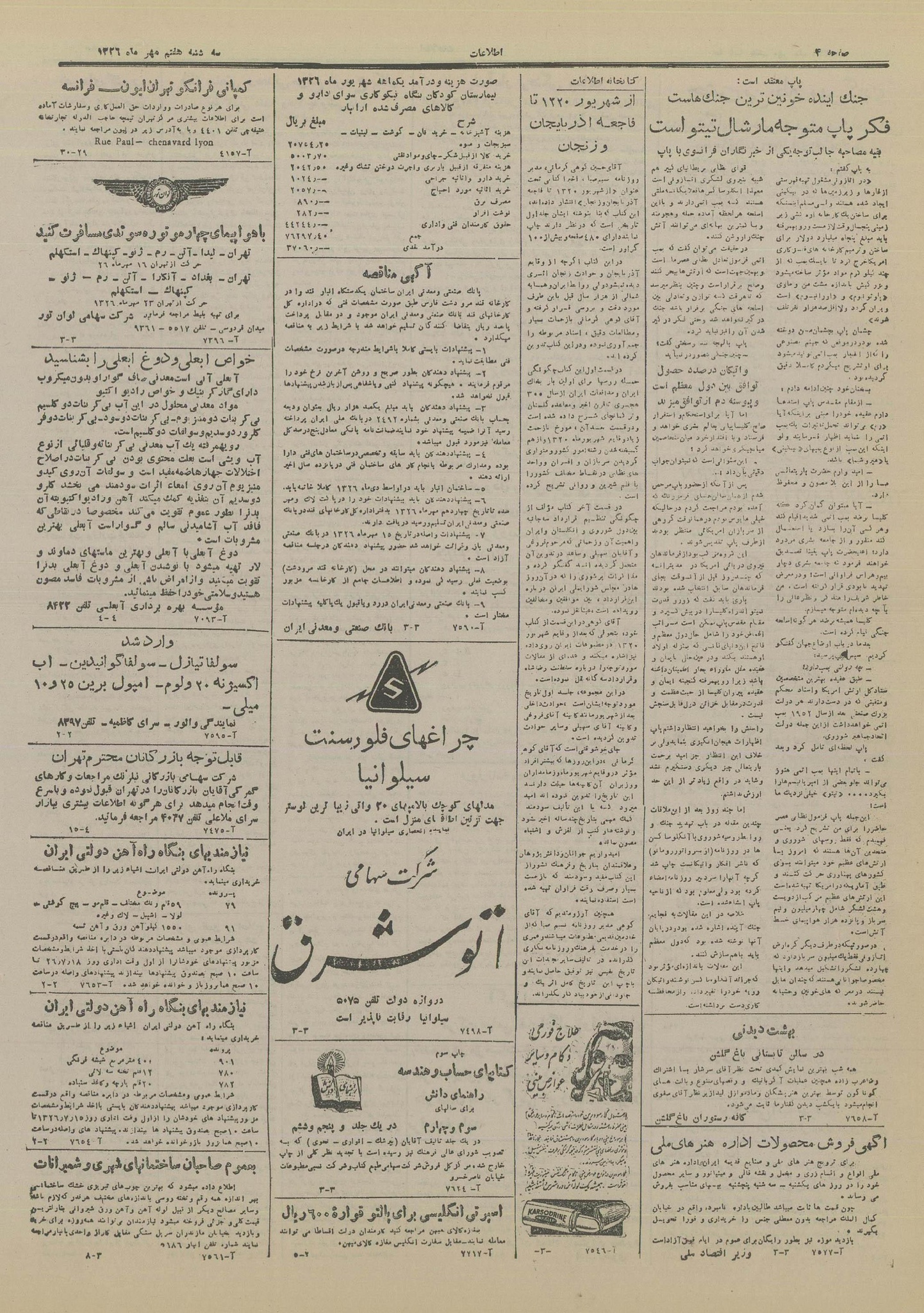 | کنونی | ۱۹ سپتامبر ۲۰۲۵، ساعت ۱۶:۵۴ | ۴٬۴۴۵×۶٬۲۴۳، ۶ صفحه (۵٫۵ مگابایت) | Bijan (گفتگو | مشارکتها) | == خلاصه == {{PD-Iran}} رده:روزنامه اطلاعات سال ۱۳۲۶ |