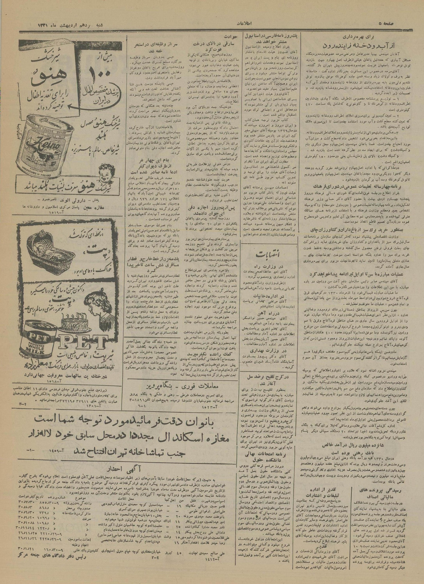 | کنونی | ۲۵ سپتامبر ۲۰۲۲، ساعت ۰۵:۳۶ | ۴٬۵۵۸×۶٬۲۵۸، ۱۰ صفحه (۸٫۸۸ مگابایت) | Bijan (گفتگو | مشارکتها) | == خلاصه == {{PD-Iran}} رده:روزنامه اطلاعات سال ۱۳۳۱ |