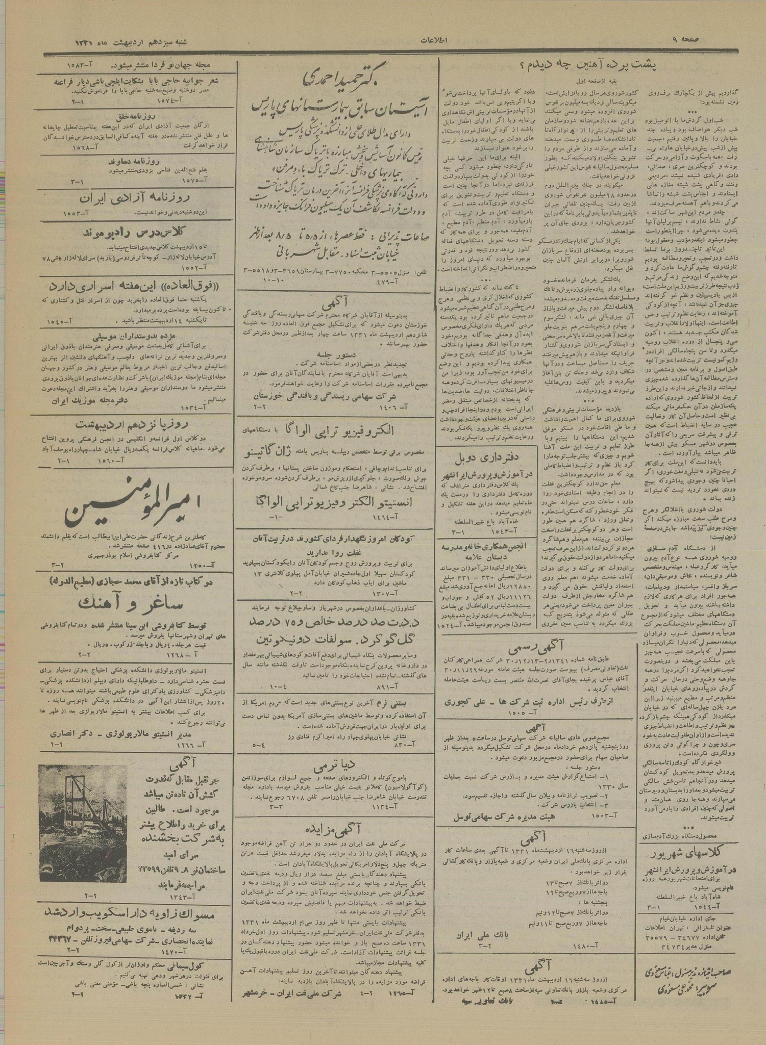 | کنونی | ۲۵ سپتامبر ۲۰۲۲، ساعت ۰۵:۳۶ | ۴٬۵۵۸×۶٬۲۵۸، ۱۰ صفحه (۸٫۸۸ مگابایت) | Bijan (گفتگو | مشارکتها) | == خلاصه == {{PD-Iran}} رده:روزنامه اطلاعات سال ۱۳۳۱ |