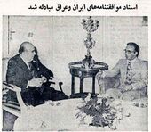 ۱ تیر ماه ۲۵۳۵ وزیر خارجه عراق سعدون حمادی همراه با هیاتی از پایوران وزارت خارجه عراق وارد تهران شد. عباسعلی خلعتبری و گروهی از پایوران بلندپایه وزارت خارجه برای پیشباز در فرودگاه مهرآباد آمدند. آنگاه خلعتبری و میهمانان رهسپار کاخ وزارت خارجه شدند و در یک گفتگوی پنج ساعته در آیینی سندهای موافقتنامه دو کشور را که دست آورد گفتگوها و رسیدگیهای مشترک در پی توافق الجزایر است است را رد و بدل کردند و بدین سان پیوندهای دو ملت همسایه در راهی نوین قرارگرفت. حمادی هم چنین با هویدا نخست وزیر دیدار کرد و ناهار را با وی خورد. در روز ۲ تیر ماه ۲۵۳۵ سعدون حمادی وزیر امور خارجه عراق در کاخ سعدآباد به پیشگاه شاهنشاه آریامهر باریافت و پیام احمد حسن البکر پرزیدنت عراق را به آریامهر فراداشت.