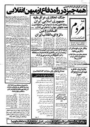 روزنامه مردم روز سهشنبه ۲۲ مهر ماه ۱۳۵۹