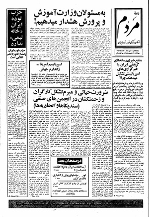 روزنامه مردم روز چهارشنبه ۱۲ شهریور ماه ۱۳۵۹