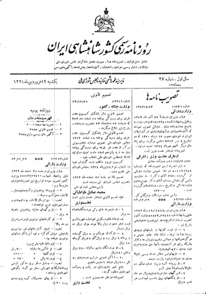 ۴ – بهای هر سطر آگهی ثبت شرکتها و شرکتهای متفرقه ۱۰ ریال ۵- بهای هر سطر آگهی نوبتی ثبت املاک ۱ ریال ۶- بهای هر سطر آگهی ماده ۹ و ۱۰ ثبتی ۲ ریال ۷ – بهای هر سطر آگهی اجرای ثبتی ۲ ریال ضمناً یاد آور می‌شود چنانچه برخلاف درخوست فوق عمل شود تا وصول وجه چاپ آگهی‌ها معوق خواهد ماند. رئیس اداره روزنامه رسمی کشور شاهنشاهی ایران هاشمی انتصابات و احکام وزارت فرهنگ جناب آقای غلامحسین رهنما استاد و رئیس دانشکده فنی باستناد ماده سوم قانون تاسیس دانشگاه و به پیشنهاد ریاست دانشگاه از این تاریخ بمعاونت دانشگاه تهران منصوب می‌شوید. وزیر فرهنگ وزارت بهداری ۱ – آقای دکتر محمد علی مؤید حکمت در تاریخ ۲۴/۱۲/۲۳ بسمت ریاست شفا منصوب گردیده‌اند. ۲ – بانو گوهر جمشیدی در تاریخ ۱۳۲۳/۱۲/۲۶ بسمت مامای بهداری شهرستان کرمان منصوب گردیده‌اند. ۳ – بانو صغری مجروب در تاریخ ۲۳/۱۲/۲۰ بسمت مامای بیمارستان شفا منصوب گردیده‌اند ۴ – آقای دکتر سید احمد فتحی در تاریخ ۱۹/۱۲/۲۳ بسمت ریاست بهداری تسوج منصوب گردیده‌اند.