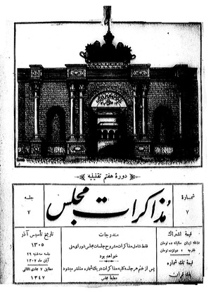 صورت مشروح مجلس روز سه شنبه ۲۹ آبان ماه ۱۳۰۷ مطابق ۷ جمادی الثانی ۱۳۴۷