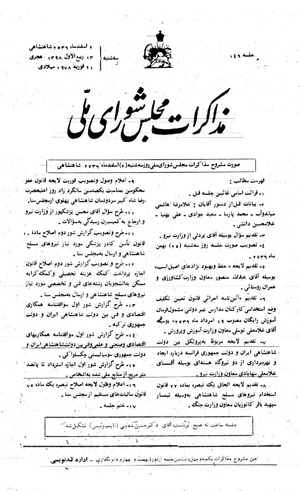 - راجع به لایحه پانصد متر زمین ملی شده که بیاید به اشخاص واگذار شود پیشنهاد مینماید: چون شکایات عدیده از اقدامات وزارت کشاورزی در زمینه ملی کردن اراضی از همه نقاط مملکت میرسد و پروندهای زیادی در این رمینه نیز در دادگستری مطرح است که بعنا وین مختلف مردم شاکی یا مشتکی عنه هستند تقاضا دارم در این لایحه ماده اضافه شود که هرکس از ملی شدن شکایت دارد و مدارک کافی دارد بدادگاه مراجعه نماید. و اختلاف طبق نظر دادگاه مرتفع شود.