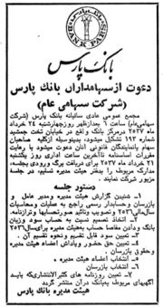 ‏۲۲ دسامبر ۲۰۱۵، ساعت ۲۲:۴۸ BankParsShareHolders2537.jpg (پرونده) ۶۱۰ کیلوبایت {{PD-Iran}} رده:فرتورها رده:سال ۲۵۳۷ شاهنشاهی ۱