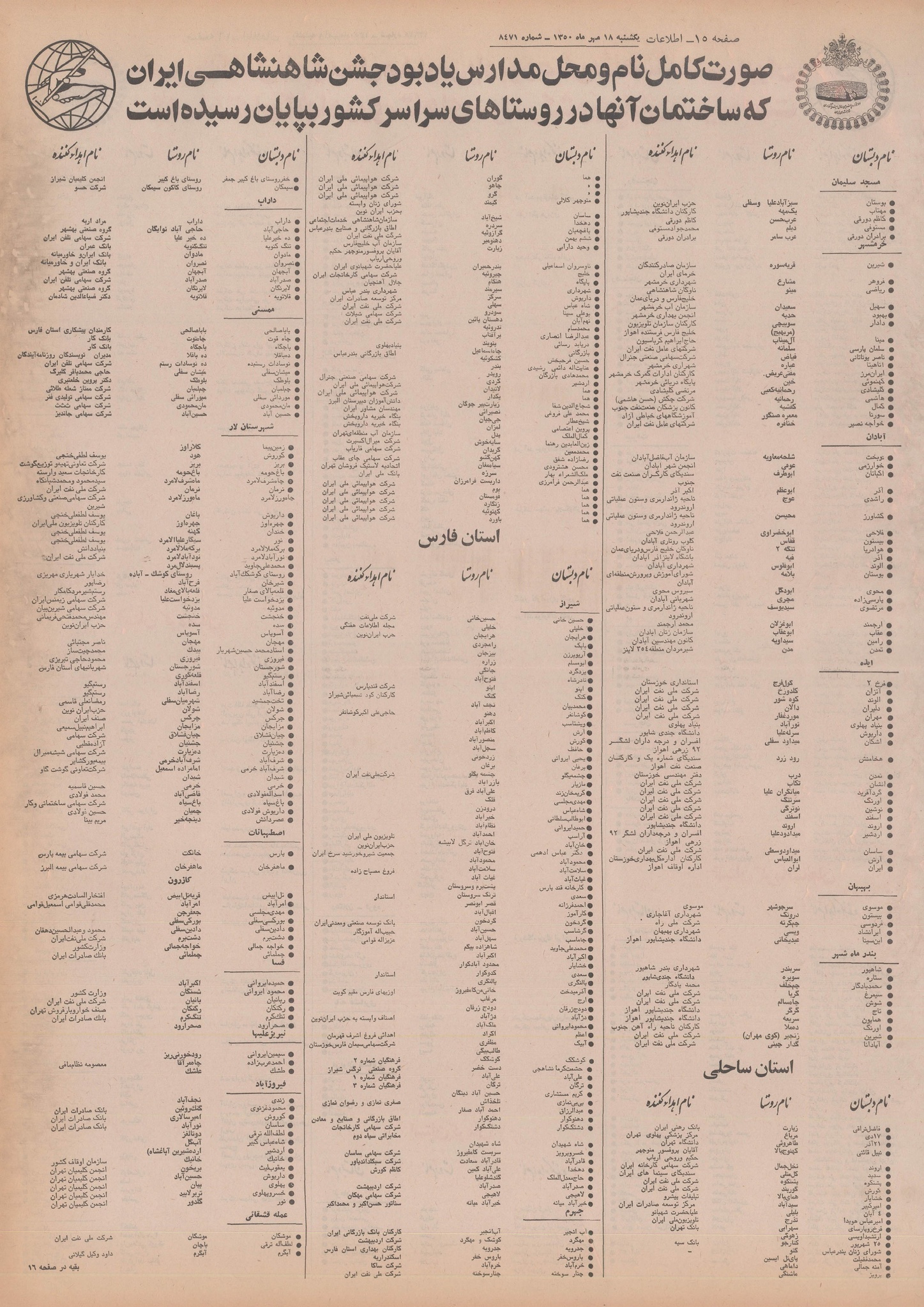 | ۲۱ اکتبر ۲۰۱۴، ساعت ۱۵:۳۱ | ۲٬۴۳۳×۳٬۵۲۷، ۱۷ صفحه (۴۲٫۵ مگابایت) | Bijan (گفتگو | مشارکتها) | {{PD-Iran}} رده:روزنامه اطلاعات سال ۱۳۵۰ |