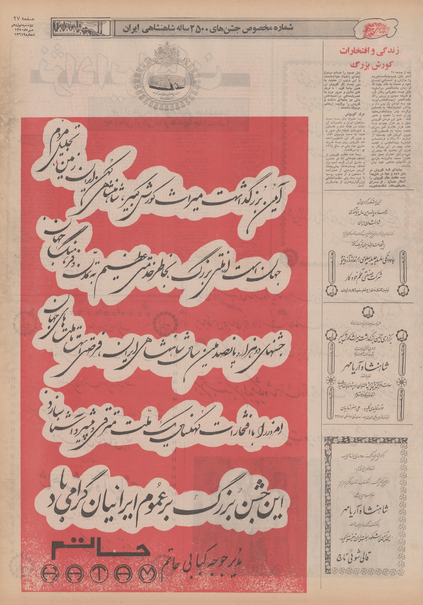| ۲۱ اکتبر ۲۰۱۴، ساعت ۱۵:۵۳ | ۲٬۴۲۰×۳٬۵۲۷، ۱۱ صفحه (۲۶٫۷۶ مگابایت) | Bijan (گفتگو | مشارکتها) | {{PD-Iran}} رده:روزنامه اطلاعات سال ۱۳۵۰ |