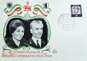[[پرونده:PostalCardVisitShahanshahWGermany1967.jpg|thumb|left|180px|کارت پستال سفر رسمی اعلیحضرتین به آلمان غربی]] | |||