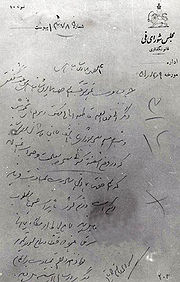 [[پرونده:LetterKashanitoShahanshah4Esfand1331.jpg|thumb|left|180px|نامه آیتالله کاشانی رئیس مجلس شورای ملی به شاهنشاه درخواست این که اعلیحضرت در کشور بمانند ۴ اسفند ۱۳۳۱]] | |||