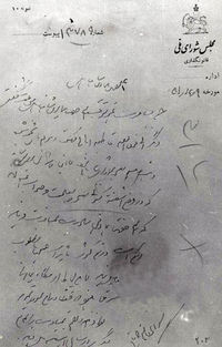 [[پرونده:LetterKashanitoShahanshah4Esfand1331.jpg|thumb|left|200px|نامه آیتالله کاشانی رئیس مجلس شورای ملی به شاهنشاه درخواست این که اعلیحضرت در کشور بمانند ۴ اسفند ۱۳۳۱]] | |||