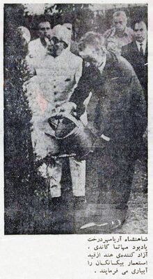 [[پرونده:ShahanshahAryamehrMahatmaGandhiGraveMehr1353.jpg|thumb|left|220px|آریامهر درخت یادبود مهاتما گاندی را آبیاری می فرمایند]] | [[پرونده:ShahanshahAryamehrMahatmaGandhiGraveMehr1353.jpg|thumb|left|220px|آریامهر درخت یادبود مهاتما گاندی را آبیاری می فرمایند]] | ||