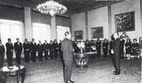 منصور نخست وزیر و دبیرکل حزب ایران نوین و هیات رییسه و اجرایی حزب در پیشگاه شاهنشاه