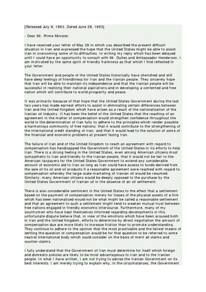 ۱۸ تیر ۱۳۳۲ نامههای رد و بدل شده میان پرزیدنت آیزنهاور و محمد مصدق نخستوزیر چاپ شد. نامههای پرزیدنت آیزنهاور نشان داد که دولت امریکا گرایشی دیگر به کمک مالی و معنوی بیشتر به ایران ندارد و در مسله نفت نیز دخالتی نخواهد کرد.