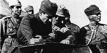 محمدرضا شاه پهلوی با ژنرال‌های ارتش شاهنشاهی نقشه هوایی آذربایجان را بررسی می‌کنند