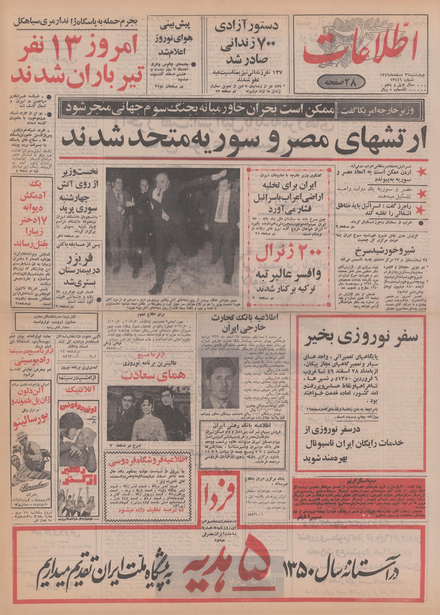 | ۲۱ اکتبر ۲۰۱۴، ساعت ۱۸:۱۱ | ۲٬۴۳۳×۳٬۴۷۷، ۱۵ صفحه (۳۸٫۰۴ مگابایت) | Bijan (گفتگو | مشارکتها) | {{PD-Iran}} رده:روزنامه اطلاعات سال ۱۳۴۹ |