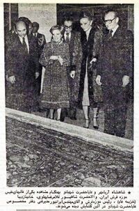 موزه فرش ایران - موزه فرش ایران در پیشگاه شاهنشاه آریامهر و علیاحضرت شهبانو فرح پهلوی پس از نیمروز شنبه ۲۲ بهمن ماه ۲۵۳۶ شاهنشاهی گشایش یافت. این موزه که به اراده علیاحضرت شهبانوی ایران بنیاد شده است، نموداری از بی کم و کاستی صنعت فرش در کشور ایران است. نام قالی همه جا با نام ایران همچم (مترادف) است و در موزههای پلودی، پتزولی میلان، ویکتوریا و آلبرت لندن، هنرهای تزئینی پاریس، هنر و صنعت وین، متروپولیتن نیویورک و موزههای دیگر نمونههای اصیل قالی به نمایش درآمده است. در این آیین والاحضرت شاهپور غلامرضا پهلوی و همسرشان اعلیحضرتین را همراهی میکردند.