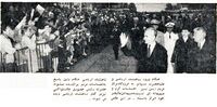 آریامهر در پای پلکان هواپیما با هویدا و علم وزیردربار گفتگو می‌کنند