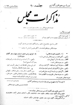 غائبین بیاجازه- آقایان: تولیت، ذوالقدر، صفوی، صدر، خواجه نوری، جلایی، دکتر ادهم، دبستانی، آصف، صادق وزیری، گرگانی، دکتر نفیسی، معدل