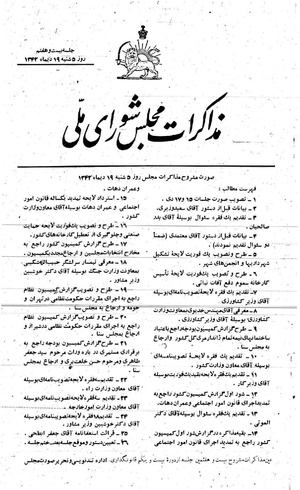 هشتم حکومت نظامی است و از اول ماه نهم حکومت نظامی وجود ندارد بعد سه ماه بعد یک تصویبنامه دیگری میگذراند که نخیز ما نفهمیدیم، حکومت نظامی در همان ماه نهم هم بوده و در این موقع حکومت نظامی را ملغی میکنیم. علی ای حال ما در مقابل عمل انجام شدهای هستیم و این موضوع تمام شده است. اما من علاقه مند بودم که باین قضیه واقعا توجه شود و دولت توجه کند و دولتهای آتیه توجه کنند. صحیح است که ما بسابقه انقلاب عظیمی که در این مملکت انجام شده و احترامی برای ان قائل هستیم و باید منتهای علاقه و همکاری را در انجام کارهائی که دولت انجام داده یا انجام خواهد داد ابراز کنیم اما در عین حال ما نمیبایستی هیچوقت از اصول منحرف بشویم تا بعدا نسلهای بعدی وقتی این جریانات را ببینند برای ما خوشنامی بار نیاورد البته اگر دولت بتواند توضیح کافی بدهد مخالفت خودم را پس میگیرم ولی میدانم با اینکه مخالفت میکنم این کاری است انجام شده (احسنت).