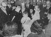 شهبانو هنگام ورود به بنگاه حمایت مادران و نوزادان و دکتر موتمنی مدیر عامل بنگاه در روز مادر ۱۳۴۷