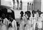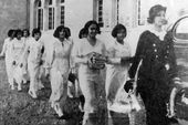 دختران پرستار در پسواز خودروی رضا شاه بزرگ پس از پایان جشن کشف حجاب و فارغ‌التحصیلی