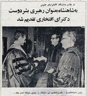 - ↑ فراداشت دکترای افتخاری دانشگاه کالیفرنیای جنوبی به پیشگاه اعلیحضرت همایون محمدرضا شاه پهلوی آریامهر کاخ نیاوران ۶ اردیبهشت ماه ۱۳۵۴
