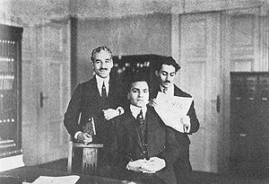 ویراستاران روزنامه کاوه از راست: محمدعلی جمال‌زاده، حسن تقی‌زاده، رضا تربیت