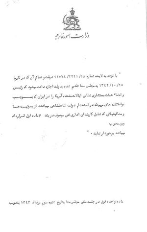 سفارت امریکا در تهران ، تشکرات و ارادت صمیمانه خود را تقدیم وزارت امورخارجه پادشاهی ایران مینماید و احتراما دریافت یادداشتهای شماره ۹۷۶۰ و شماره ۹۷۶۲ ، هر دو به تاریخ ۹ دسامبر ۱۹۶۴ آن وزارتخانه و در پاسخ به یادداشت شماره ۲۹۹ مورخ ۱۸ دسامبر ۱۹۶۳ این سفارتخانه را به اطلاع میرساند و تایید ی نماید که یادداشتهای مذکور در فوق آن وزارتخانه در عین حال از سوی ما در حکم پاسخی مطلوب و پذیرفتنی محسوب میشود.