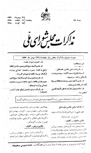 - طرح و تصویب لایحه نسخ قانون مصوب ۱۶ تیر ماه راجع به اهداء، زمین و ساختمان اهدائی به وزارت فرهنگ
